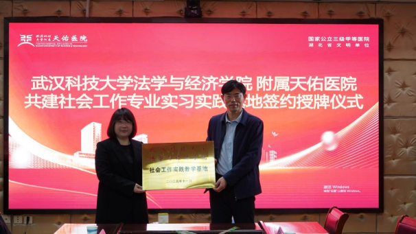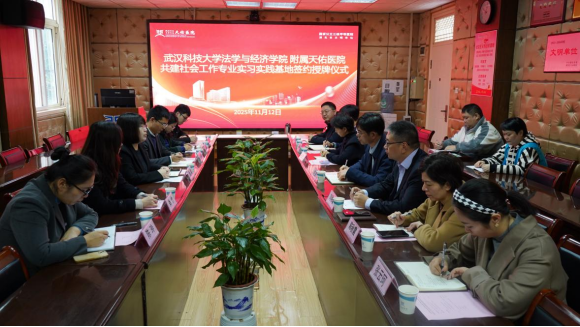 为加强社会工作人才培养,助力医务社工赋能医疗服务,11 月 12 日上午,法学与经济学院与附属天佑医院共建实习实践基地签约授牌仪式,在附属天佑医院行政楼 1 号会议室顺利举行。附属天佑医院党委书记许立桥、党委副书记兼副院长刘明瑜、副院长田胜兰、医务社工部负责人郑重,法学与经济学院党委书记杨彦、党委副书记彭晓峰、社会工作系主任肖竹、社会工作(MSW)教育中心主任宁雯雯,以及教师陈玲、覃恺洋等人参加活动。签约授牌仪式由刘明瑜主持。