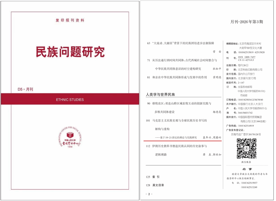 (通讯员 杨均琪)近日,从中国人民大学书报资料中心传来喜讯,我院袁年兴教授和周藤岭同学合著的学术论文《马克思主义民族史观与全球民族历史书写的解构与重构——基于19-21世纪的理论与实践研究》,在《武汉大学学报(哲学社会科学版)》2025年第6期发表后,被“人大复印资料”《民族问题研究》2026年第3期全文转载。